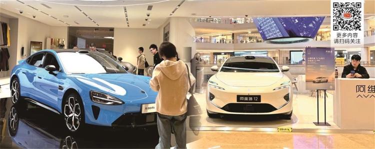 左图为小米汽车员工直播卖车, 右图为阿维塔上海一家体验中心。 梅双/摄